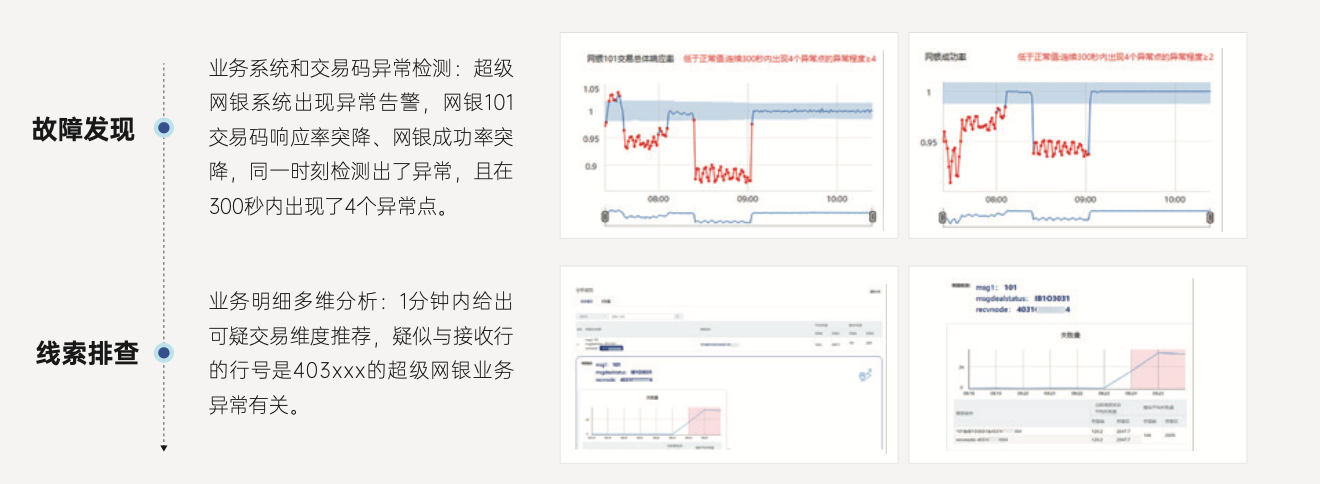 本场景通过智能检测技术对业务黄金指标进行异常检测,准确识别业务指标时序曲线的反常变化,及早发现故障和风险;此 外在应用告警关联业务明细多维分析出的故障线索,快速判断故障影响范围,定位异常根因维度。整体提升告警准确率,实 现业务故障预警,同时辅助管理员进行故障排查,缩短故障发现和业务系统恢复时间。