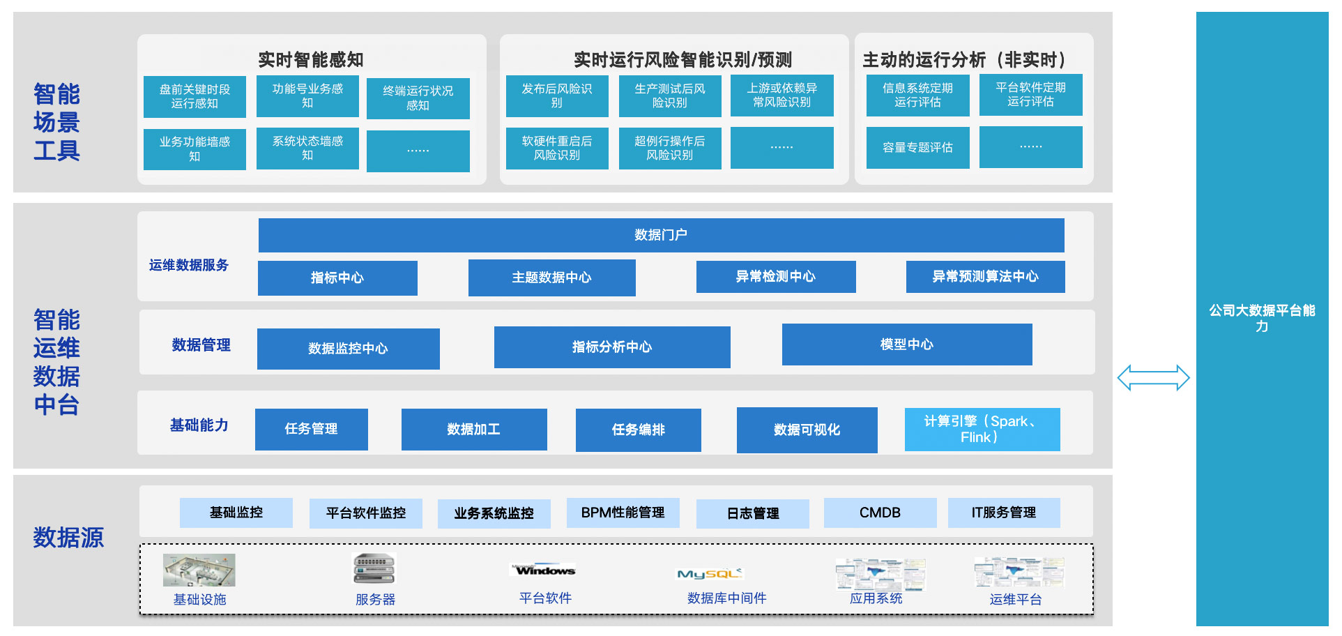 智能运维场景工具层以运维数据中台服务能力为支撑,构建了智能业务感知、运行分析、巡检分析、应急中心等在线、离线的数据分析场景。