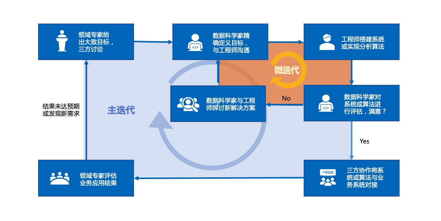 根据澳门大学倪明选老师的协“协作式迭代流程”应用于智能运维领域的思路,项目启动时,由领域专家给出大致的目标并经过三方讨论,在由数据科学家精准定义目标后,由工程师来搭建系统或实现分析算法。此过程中由数据科学家对系统或算法进行评估,如不满意就进入微迭代过程。由数据科学家与工程师讨论微迭代的解决方案并定义目标再进入实施和评估的过程。如结果满意,便进入与业务系统对接的“主迭代“过程,之后由领域专家评估业务对应结果后,再判断结果是否达到预期以及是否有新的需求...最终通过多方协作和循环迭代,解决智能运维系统在落地实施出效果所面临的具体问题。