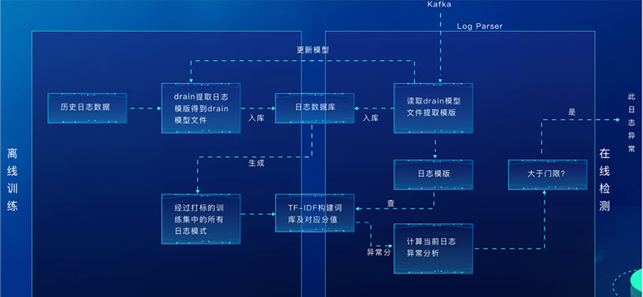 在线检测部分,接收来自kafka的实时日志数据,采用drain算法实时解析日志模板,针对日志模板中每个分词的异常分数求和,如果该值大于我们根据故障标签总结出的门限,则认为日志出现异常。