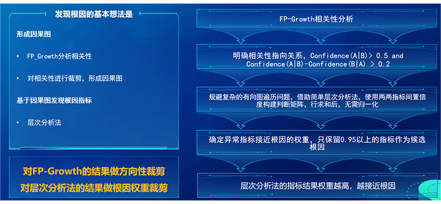 1. 形成因果图:这里首先采用FP-Growth算法分析出异常指标之间的相关性,然而相关性不一定能代表因果性,所以这里还对FP-Growth的结果做了一定的裁剪工作,异常指标之间的置信度必须大于0.5,且正向和反向的置信度差值必须大于0.2,相关关系中取置信度大的方向作为因果方向,这样就形成了因果有向图。